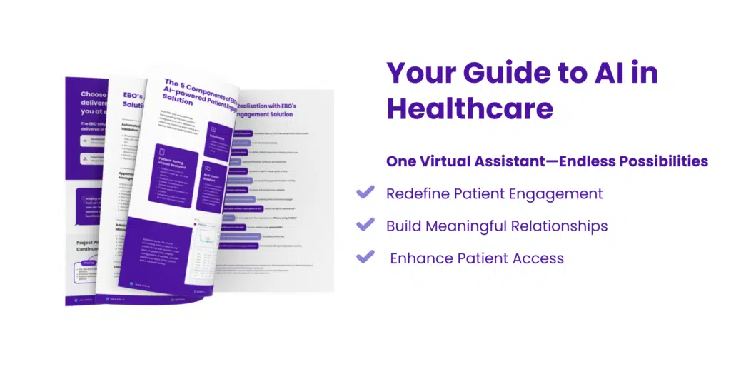 Harnessing the potential of Conversational AI, EBO develops AI solutions in the form of highly customisable AI Virtual Assistants (VAs). Our VAs engage with patients via 2-way natural dialogue that simulates human conversation between healthcare service providers and patients to deliver meaningful conversations at any time, in over 100 languages and on any channel of choice.
