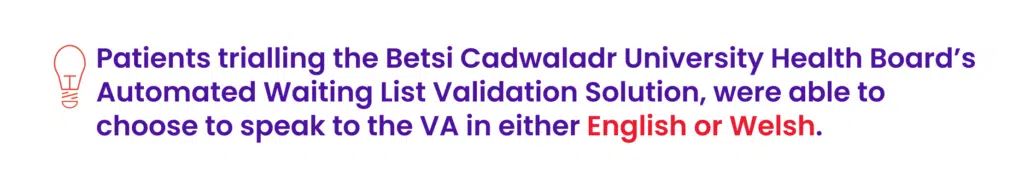 Prioritising patient accessibility, EBO’s solution breaks language barriers by enabling patients to speak to a VA on any channel of choice in over 100 languages. But that's not all – our Virtual Assistants are multilingual; they can seamlessly communicate in Farsi, Russian, and Greek, expanding their capabilities across diverse industries. It's like having a friendly chat with a friend, no matter where you're from. Learn about EBO's Waiting List Validation Solution for Betsi Cadwaladr University Health Board here.