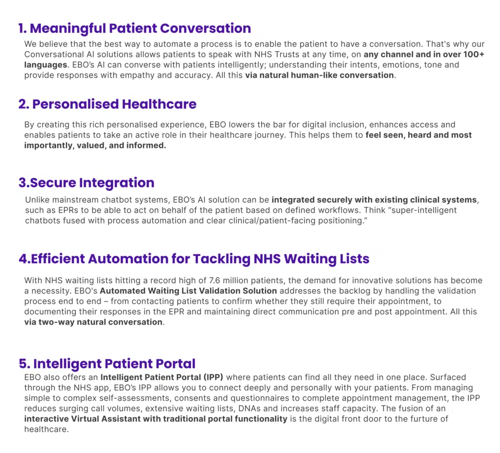 EBO bridges the communication gap in healthcare and places conversation at the heart of its solution. We help healthcare providers to automate patient facing processes end-to-end, thus releasing efficiency, increasing work capacity, reducing costs, and enhancing patient communication. Here's how: