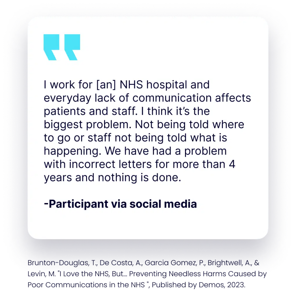 A report issued by Demos "I LOVE THE NHS, BUT...": Preventing needless harms caused by poor communications in the NHS dissects a prevalent issue in the healthcare system—the critical lack of communication within the National Health Service (NHS). Initially cautious about disclosing their experiences, participants—encompassing patients, NHS staff, and the public—underwent a notable transformation when prompted to share their opinions about the NHS. With a focus on delivering feasible solutions, the report sheds light on how bolstering communication can support the NHS in effecting positive changes. Highlighting critical issues impacting both patients and staff, the report dismisses the notion that communication is a mere 'nice to have,' underscoring its fundamental role in the seamless functioning of the NHS. Continue reading below to discover the roadmap for change.